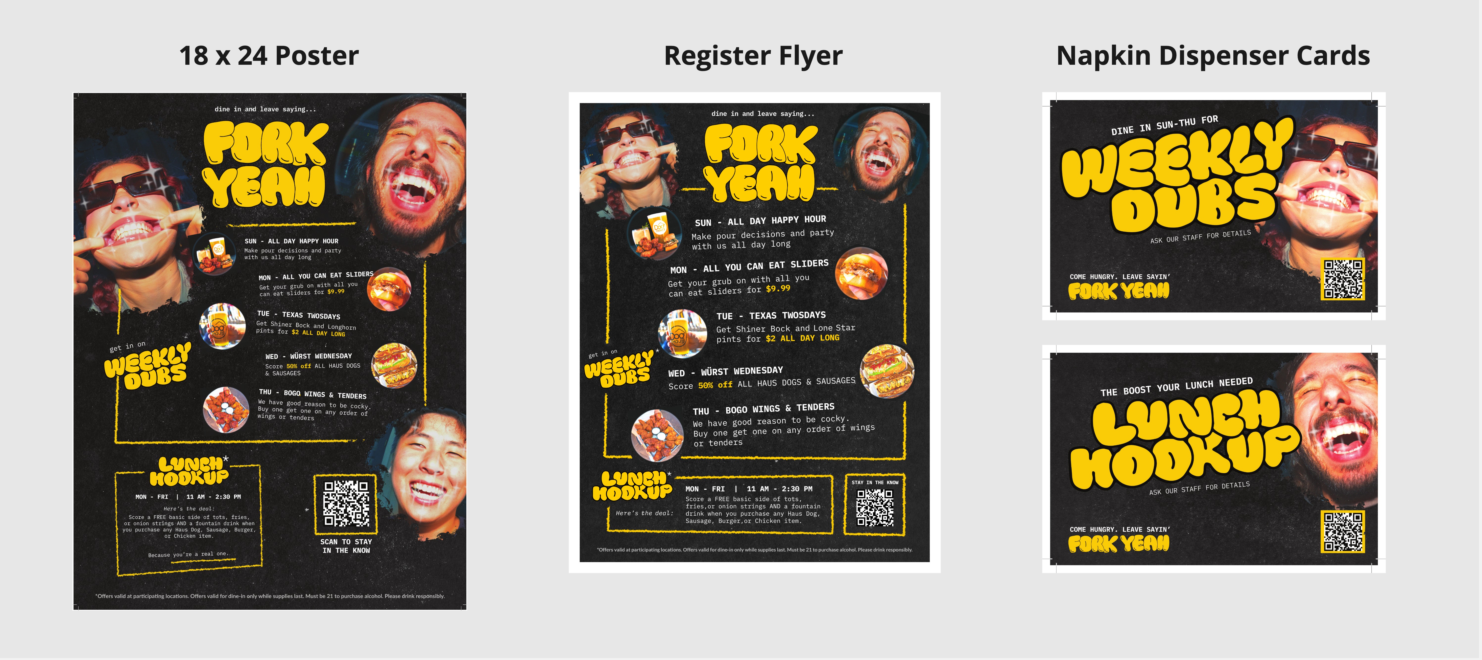 Fork Yeah was a high-energy, Gen Z–friendly promotion designed to build hype, encourage repeat visits, and position Dog Haus as the go-to destination for fun, flavorful, and share-worthy meals. The campaign leaned into bold visuals and playful language to create an emotional payoff that matched the dining experience itself—so guests would leave saying exactly what the name promises: Fork yeah. Through cohesive branding and social-first execution, the promotion reinforced Dog Haus’ irreverent voice while driving excitement, engagement, and return visits.